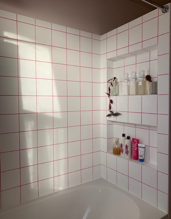 I’ve tried to face my grout fears by going over the top and dyeing the grout hot pink in our family bathroom — and actually, this worked to a degree.